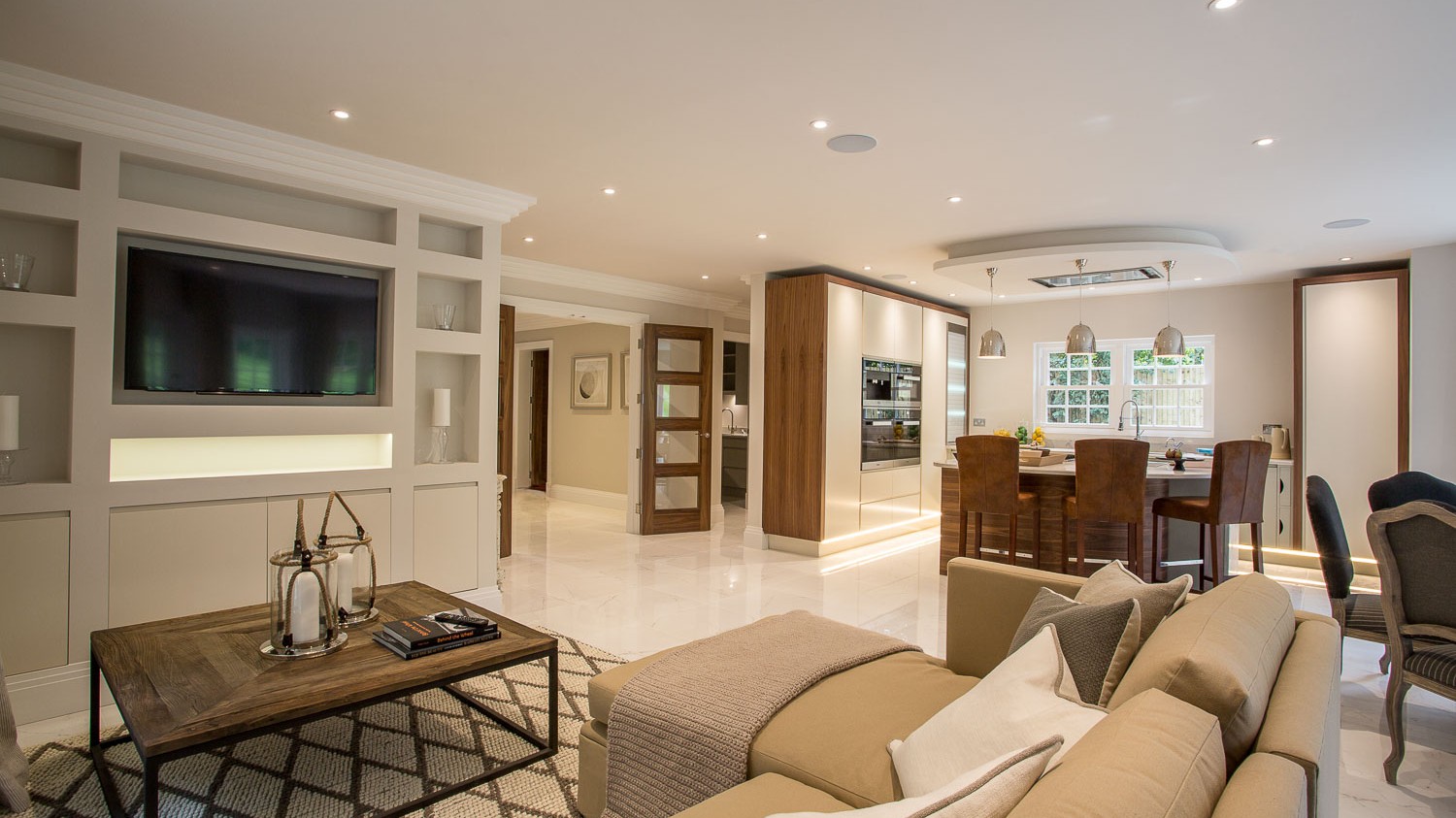 Despite their impressive scale, the entertaining spaces retained a warm homely feel with beautiful joinery and fittings throughout. Upstairs the master bedroom was designed with a central bed facing out to the landscaped rear garden, alongside a stunning ensuite bathroom with floor to ceiling marble wall, creating a hugely opulent feeling.